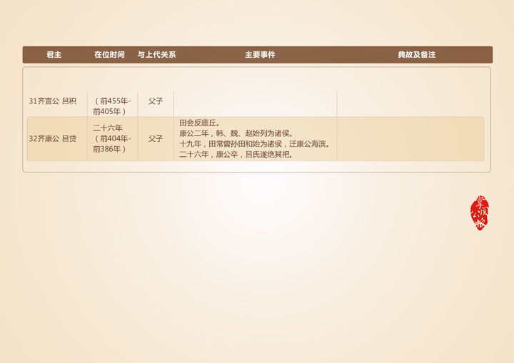 。康公二年,韩、魏、赵始列为诸侯。十九年,田常曾孙田和始为诸侯,迁康公海滨。二十六年,康公卒,吕氏遂绝其祀。田氏卒有齐国,为齐威王,强于天下。